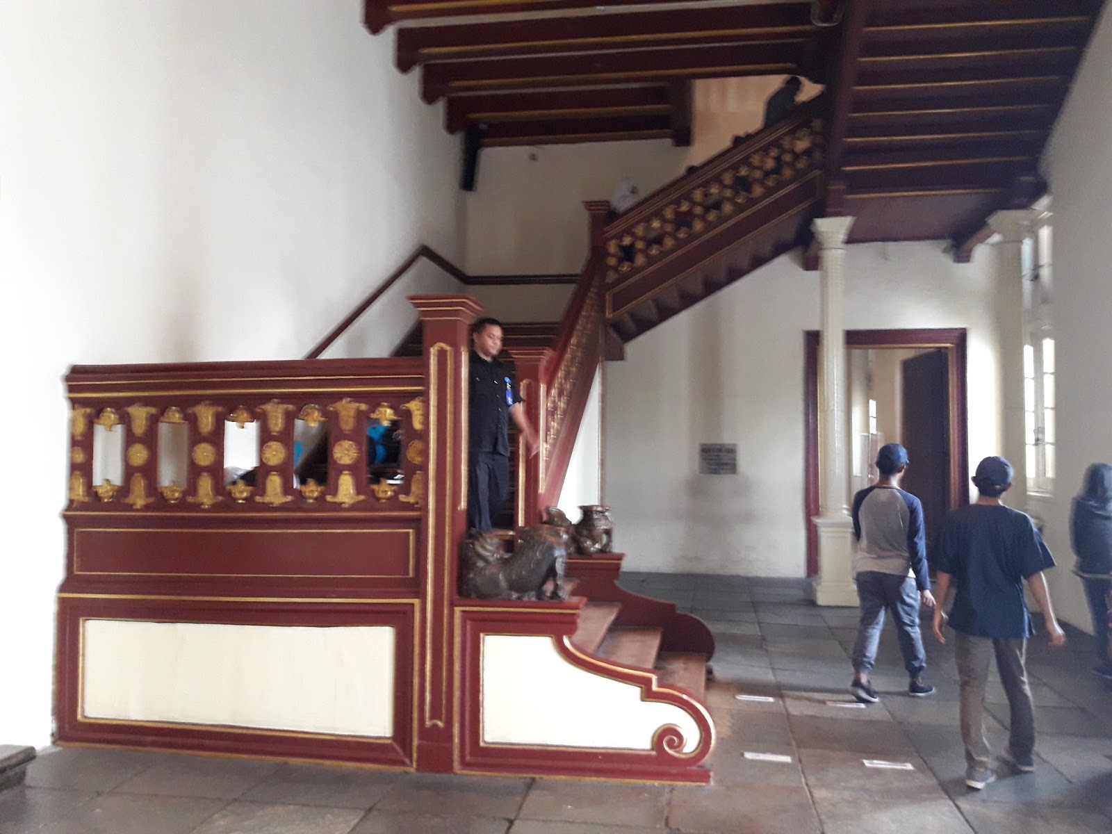 Setelah puas melihat benda-benda di lantai bawah, saya lalu naik ke lantai atas. Wih.. tangganya keren sekali. Di sisi kanan dan kiri tangga, ada patung berbentuk hewan. Ehm, ini hewan apa, ya? Sepertinya tangga ini dibuat bergaya negeri China. Model dan ukirannya sangat keren.